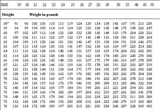Use this chart to see whether your weight puts you at increased risk for health problems. Find your BMI in the left-hand column. Then, locate your waist size in one of the top columns. The box where the two meet shows your level of risk.