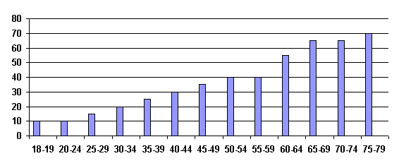Age Group Figure 1. Percent of employed U.S. adults and seniors with at least one carious or filled root surface lesion - 1985 - 1986. (National Institute for Dental Research survey) |