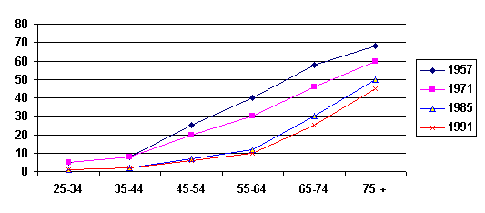 Figure 1. Edentulousness in U.S. adults, 1957, 1971, 1985 and 1991 5-7