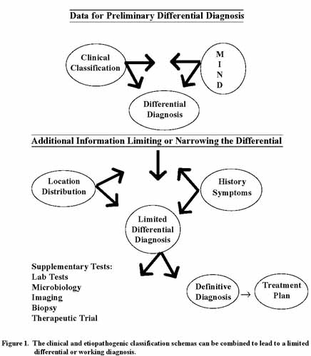The clinical classification approach to differential diagnosis of oral soft tissue lesions can be correlated with histopathologic findings. As discussed for each clinical group of lesions, this correlation will allow the clinician to visualize and understand what is occur clinician integrates the clinical and etiopathogenic classification schemas, the various lesions become mentally manageable. Therefore a combination of these two approaches, if performed correctly, will lead to a limited differential or working diagnosis (Figure 1).